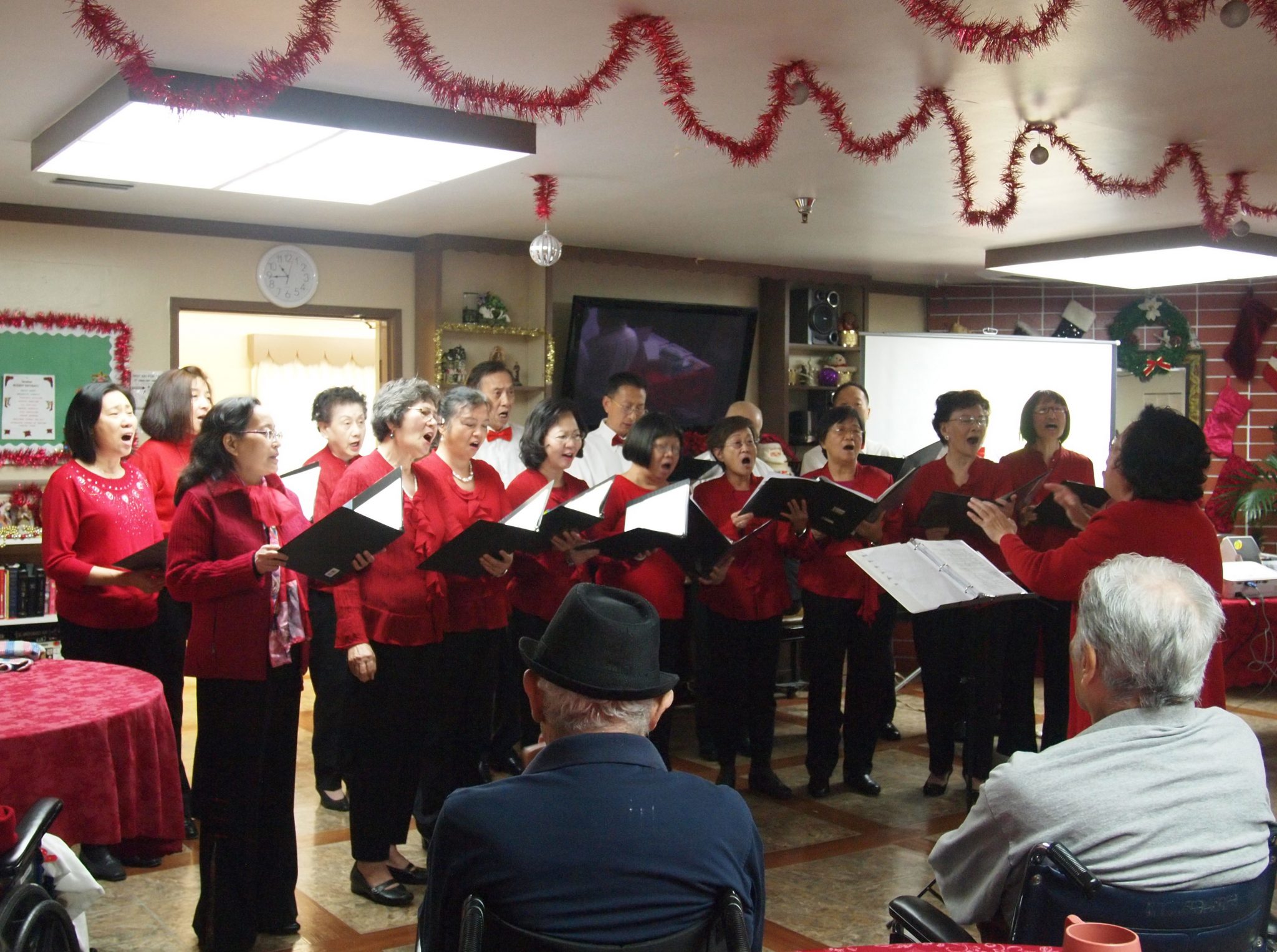 水仙合唱團是由一群華裔癌友、家屬及關懷義工組成,期望透過充滿生命力的歌聲,傳揚上帝的愛和恩典。去年 12 月 20 日有 17 位合唱團團員在位於 Pomona 市的 Chino Valley 康復中心有一次愛心獻唱活動,其中亦包含了聖誕歌曲,紀念耶穌基督的降生,也盼望將耶穌的愛透過歌聲和行動,傳遞給康復中心的朋友。