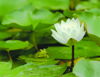 在碧波之上、翠綠荷葉叢中,一眼就看到這朵亭亭玉立、舒展盛放的荷花。在陽光照耀下,潔白無瑕的花瓣透出亮光;在片片綠葉的映襯下,更突顯其清秀、雅潔、可愛,魅力非凡!連小青蛙也被吸引而來,靜靜觀賞。