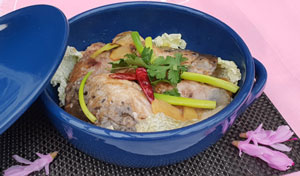 1.將雞髀肉去皮、洗淨,切件,放下泰式 魚露、椰糖、1湯匙紅咖哩膏、2湯匙水及粟粉拌勻,略醃30分鐘備用