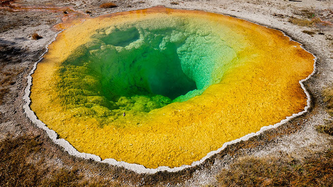 我們旅程的另一站是黄石國家公園,忠實間歇泉(Old Faithful Geyser)是黃石國家公園最著名的景點,在那裡還有一個美不勝收的溫泉,它名叫「早晨的榮耀」(Morning Glory)。1883年,國家公園助理部長的妻子麥克高恩夫人(Mrs. McGowan)為其命名,她之所以選擇這個名字,是因為她認為這溫泉好像牽牛花,牽牛花的直譯是「早晨的榮耀」。在1940年代之前,「早晨的榮耀」是一個如水晶般清澈的溫泉。然而,多年來,無數遊客將硬幣、石頭和其他雜物扔進溫泉,這些外來物體阻塞了地下熱源,導致其溫度降低。結果,許多微生物滋生在溫泉中,使清澈的水變成了碧綠色。國家公園嘗試清理那些垃圾,但已經無法令顏色逆轉。現在的「早晨的榮耀」有了一個綽號:「衰落的榮耀」(Fading Glory)。