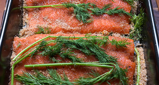 - 用兩吋厚的烤盤,底部放好兩株蒔蘿,撒下一半的鹽糖粉。將鮭魚皮朝下、肉朝上放置好,將剩餘的蒔蘿、鹽糖粉、檸檬皮、黑胡椒等,撒在魚肉上。