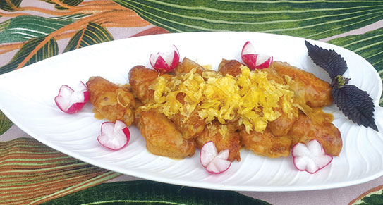 - 鑊內放入牛油煮至融化後加入蒜蓉、咖喱葉炒香,放入淡奶和少許鹽,煮滾後加入雞翼煮至汁液微微濃稠,上碟後灑上蛋絲便完成