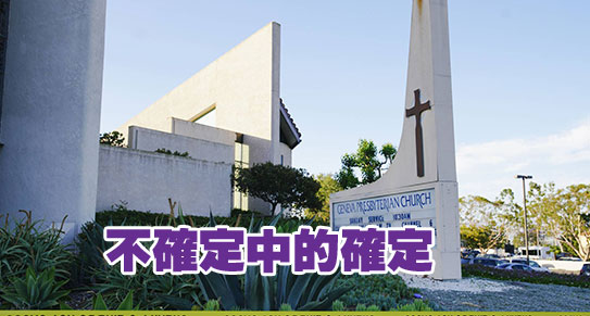 所以,且讓我們繼續用禱告來托住南加州爾灣台灣基督長老教會的眾肢體、牧者,及鄭醫師家人的同時,把信心建立在為我們創始成終的基督耶穌身上,昂然闊步,抬頭挺胸,面向人生在世一切的不可知,不確定,因為只有我們的神是可知、是信實、是永不改變的!