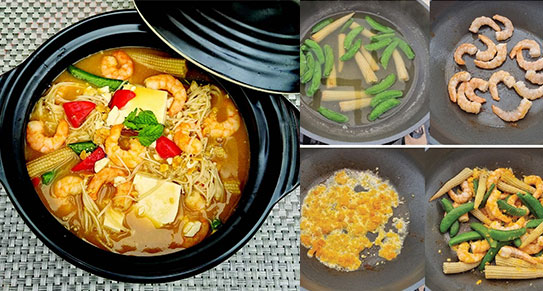 - 鑊內放入1湯匙生油將大蝦煎熟盛起