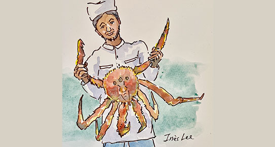 「第一次與帝王蟹相遇是大女兒剛訂婚不久時,我們第一次到一家中餐廳與準親家見面,當時我們雙方還有點陌生。老闆娘特地過來建議我們選擇那隻在水族缸裡獨居的帝王蟹。她也建議三種吃法,還說螃蟹汁可以拌炒麵。我和親家面面相覻,不知道是否該順著老闆娘的建議。