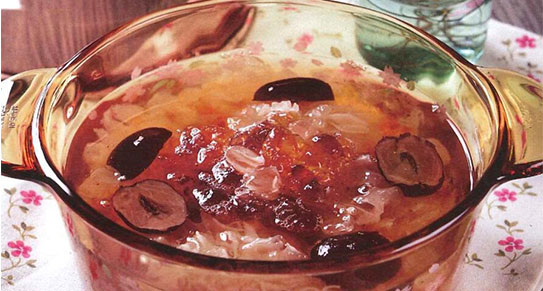 6. 將1.5公升水煮滾後,放入桃膠以外所有材料煮半小時,放入桃膠再煮半小時,最後放入紅糖煮至溶化便可。