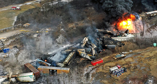 2月3日夜間,一列諾福克南方鐵路公司有150節車廂的貨運火車,在經過俄亥俄州東部靠近賓州的東巴勒斯坦鎮時,約有30節車廂脫軌,無人受傷,但有起火。