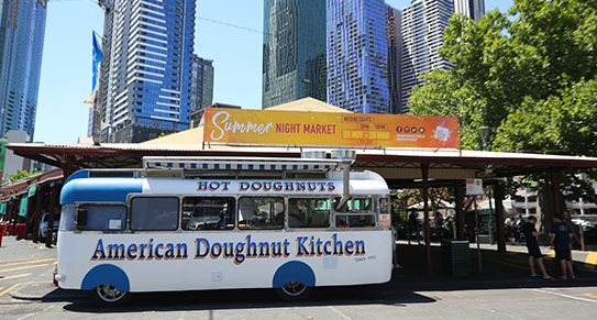 在維多利亞女王市場裡,你會發現一臺可可愛愛的白色懷舊麵包餐車,用大大的藍色字印着「American Doughnut Kitchen (美國甜甜圈廚房)」,的確是貨真價實的廚房。你是不是感到奇怪,怎麼是美國的甜甜圈廚房呢?原來,美國的美食甜甜圈,中間挖個洞灌上果醬的做法,不僅美國人喜歡,在澳洲也極受喜愛。