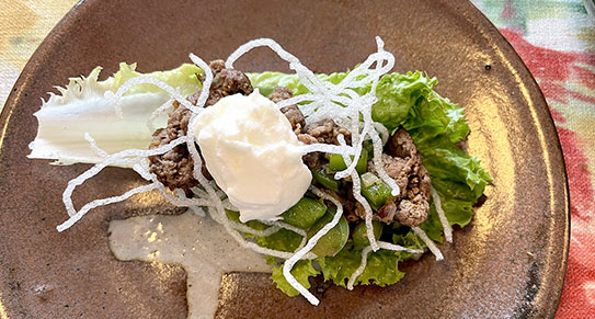 上菜後,將一片生菜葉打開放置盤中,上加羊肉碎、油炸好的粉絲、酸奶(油),捲起來吃,就是一道不油膩、又美味的孜然羊肉菜捲了。