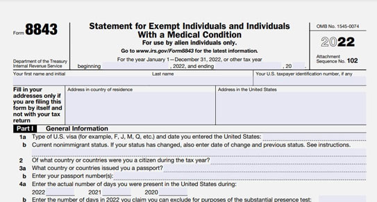 8843表格全稱為「Statement for Exempt Individuals and Individuals with a Medical Condition」;顧名思義,它是為豁免個人(在稅法定義上,豁免個人是可以豁免不算待在美國的日子),和身體特殊原因的人(因為求醫就診原因而不能離開美國,但不算待在美國的日子),而設計的表格。