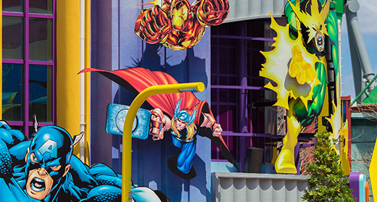 再走一會是漫畫園,展出的是馬威漫畫的一眾人物。讀者也許會問,馬威不是給迪士尼收購了嗎?為何會在競爭對手環球片場的主題公園出現?原因是漫畫園是在馬威被收購前七年開啟的,當時馬威樂於授權給各大製片商來合拍其漫畫人物的電影,更樂於授權冒險島構建一個馬威漫畫園區。當中的主打4D機動遊戲,是乘坐衝鋒車與蜘蛛俠攜手擊退邪惡聯盟,拯救紐約市。園內有一個售賣漫畫及電影模型的商店,有大量市面很難買到的限量版模型;而整條街則展出幾個大型的漫畫英雄雕塑,供遊人拍照留念。