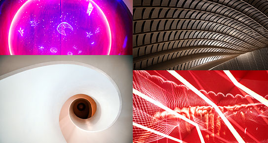在這輯圖片中,我故意掩藏了地方特色,因此,即使在香港長期居住和熟悉香港環境的讀者,都可能看不出相片中的主體是什麼,讓我來揭開謎底吧!舉例說,其中一張照片呈現出類似螺旋蝸牛殼的形象,其實那是香港M+博物館的樓梯;另一張照片的景象好像是外星人的太空船,那是香港故宮博物館的天花板;另一張在紅色圓門上投射了日月星辰圖案的照片,其實是兩張相片的合成品,一張攝自香港科學館的天文展覽,另一張源於香港歷史館的展覽;另一張抽象圖案也是香港文化館兩個不同展覽的合成品。我這樣做並不是為了故作驚人,而是由於我認為,若果一張作品引發出的感覺,並不是基於人們對事物的歷史、文化知識,這種美感會比較純粹。