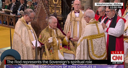 • 權杖 (The Scepter):象徵上帝的權柄,代表君王要以公義執政。大主教交權杖給查爾斯三世,說:「請接受公正與憐憫之杖。」