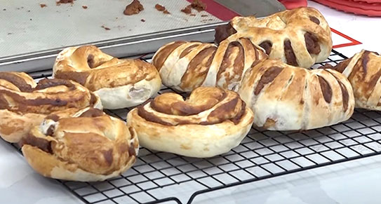 - 另做一個花形—把麵團壓成橢圓形後,在上面及斜位鎅開數刀,把它反過來,然後捲起,再把它扭過來,收口。