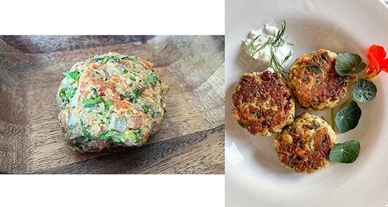 由於居住地區沒有新鮮螃蟹,罐頭螃蟹又昂貴得出奇,因此想到用新鮮魚類 —— 鮭魚 (Salmon) 和斑眼魚 (Walleye) 合併製成魚餅 (Fish Cake),色澤半白半橙,加上香菜的鮮綠,視覺上的美,令廚師在攪拌過程中非常愉悅。