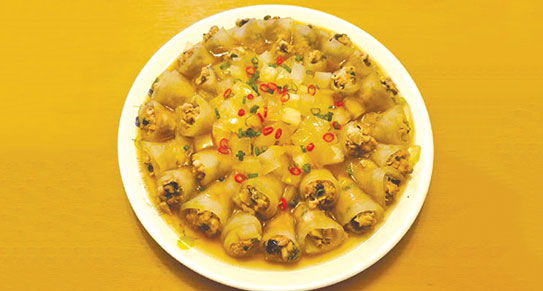 - 冬瓜片抹乾水份,將肉餡放在冬瓜片上,然後輕輕捲起,放在碟上待水開後隔水蒸 10分鐘至熟透。