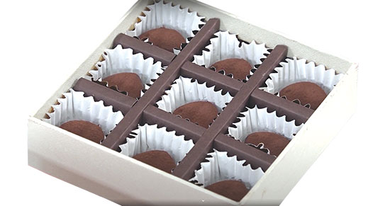 - 巧克力脫模後,每粒巧克力均勻灑上可可粉。