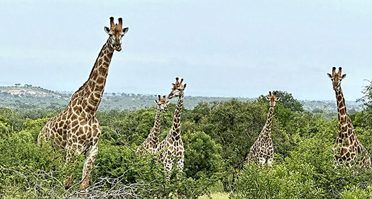 在南非21天,看到了許多動物,在一望無際的大草原上看到一群群悠遊自在的大象、長頸鹿、斑馬、羚羊、疣豬、斑鬣狗、犀牛、河馬、獅子和豹等各樣動物,聽導遊細說牠們的生態、與大自然及其他動物共存的方式和怎樣在競爭中自保,讓人不禁驚嘆造物主的偉大設計。