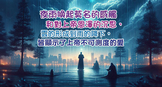 約伯說:「祂行大事不可測度,行奇事不可勝數:降雨在地上,賜水於田裡。」(《約伯記》五章9-10節) 雲的凝結、雨的降下等大自然現象,都彰顯上帝的愛!