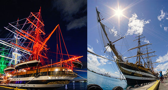 今年七月下旬,它停靠在夏威夷檀香山的九號碼頭。我和朋友排隊苦候了一個半小時,才有機會上船一睹其風采,雖然這艘船採用鋼鐵建造,但其設計類似十九世紀初的木製軍艦,可說是古色古香。我在四個不同的時間和地點拍攝阿美利加號,地點包括了在船上 、碼頭,還有在自己的陽台遠眺。時間則包含了下午、黃昏、晚間。入夜之後,整條船被不同顏色的射燈映照,仿如一個童話世界。