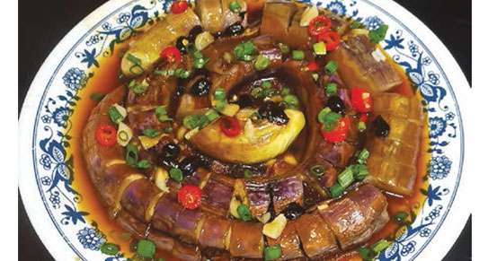 - 將蒸好的茄子汁液倒出,加入粟粉水煮滾,拌在茄子上便完成。