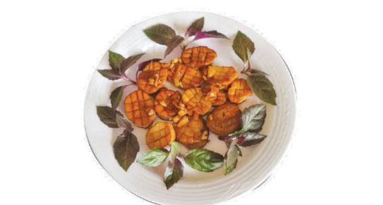 - 鍋內放1湯匙生油,將「素帶子」兩面煎至微微焦香。