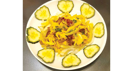 - 熱鑊後放入2湯匙生油,將炒香的叉燒、洋葱,和葱粒加入蛋液,拌勻放入油鑊,轉中小火將蛋液由外推向中間,看到雞蛋開始凝固定型,將雞蛋輕輕反轉另一面略煎,儘量使雞蛋保持嫩滑狀態,略為熟透便可上碟享用。