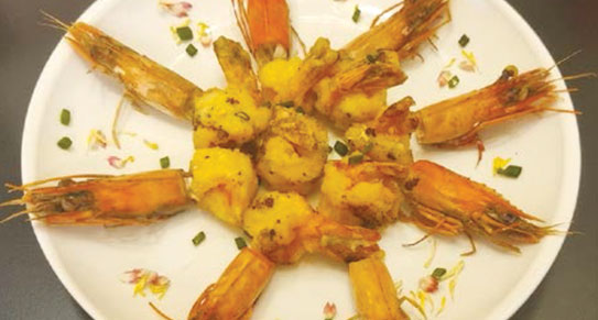 3. 先將蛋黃醬、煉奶和日本芥末調勻,放入炸脆之大蝦攪拌均勻,灑上少許葱粒裝飾便可上碟享用。