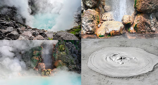 別府地獄的誕生,得益於活躍的火山地帶。九州地區的火山口活動產生大量地熱,讓地下水與火山氣體交滙,形成高溫蒸氣、泥漿池、沸騰熱泉等多樣地熱現象。早在奈良、平安時代,別府就已有「熱湯地獄」的紀錄,但真正將這些奇景觀光化、命名為「地獄」,則是在江戶時代以後。每個地獄溫泉都帶有獨特的視覺與主題氛圍:海地獄鮮藍如大海,卻滾燙如岩漿;血池地獄充滿鐵質,故此泉水呈現赤色;鬼石坊主地獄則以泥漿沸騰、起伏如剃髮僧首而得名;龍卷地獄則是不規則爆發的間歇泉,彷彿是來自地底的咆哮。這些地獄名稱,既是對自然現象的形象化詮釋,也是一種文化敘事的手法。
