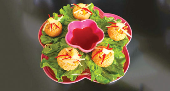 5. 鍋內放油,用小火將印度脆球炸至膨脹成球形,盛起隔油,用茶匙輕輕敲碎成一小洞,釀入餡料後放在碟上便完成。