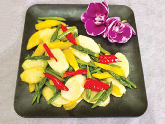 鮮淮山含大量膳食纖維,有促進腸道蠕動之效。它含有高黏度的醣蛋白,可保護胃部黏膜,有效幫助消化,適量食用還有助降低血糖。而這道鮮淮山炒蘆筍,清淡且富有營養,簡單中帶出美味。