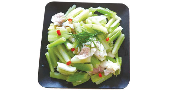 4. 鑊內放入2湯匙生油,將薑、蒜爆香,加入西芹略炒,放回焯熟的魚片,用中大火快炒,加入調味料和辣椒至收汁便完成。