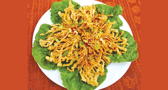 - 將油鍋內的油升溫,再將金針菇重複炸第二次迫出油分,隔油盛起放在碟上成菊花形狀,均勻灑上適量調味粉。