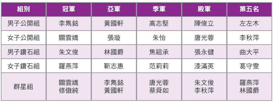 此次賽事共設立女子及男子公開組、女子及男子鑽石組,以及群星組五個組別,分別評選出冠、亞、季軍,並為各組前五名頒發由教會愛心贊助商支持的獎金,作為鼓勵與祝福。