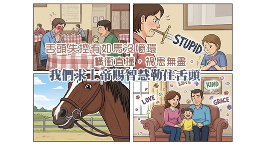在馬年談這比喻格外應景 —— 沒有嚼環的馬會橫衝直撞,傷人傷己;失控的舌頭同樣能帶來無盡禍患。馬需要嚼環,舌頭也需要聖靈掌管。