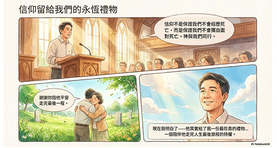 一週後,我站在教會講台上,分享他人生最後的旅程 —— 從震驚、掙扎、質問,到接納、平安、交託。我告訴會眾:「他的生命見證了信仰不是沒有苦難,而是在苦難中你仍信靠上帝。他沒有得着神蹟般的醫治,但他得到了更大的恩典 —— 臨終的平安。在他那份軟弱中的力量,以及彼此道別時的那份愛,讓我們看到:信仰不是保證我們不會經歷死亡,而是保證我們不會獨自面對死亡。因為上帝與我們同行。」
