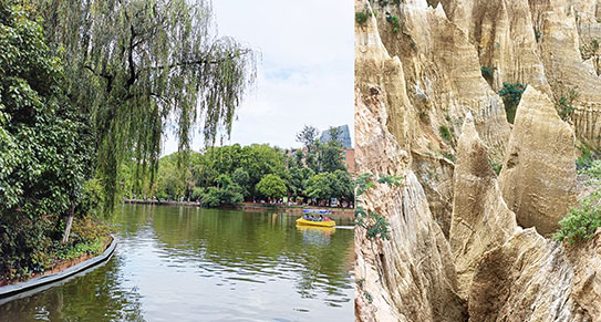 從成都坐半天高鐵抵達昆明,走訪市內翠湖公園,湖畔楊柳依依,湖上浮光掠影,間有小船遊盪;路過草地旁的小徑,忽見數隻小松鼠從樹上走下來,在草地上屏息,翹起大尾巴,忽地匆匆走去,不禁倚欄觀看,突然一隻「小霸王」追逐另一隻,致其撞入我懷,驚呼一聲,遺憾未能抱着牠。園內有田田荷花池、亭台樓閣、燕子橋及盛開的紫藤。